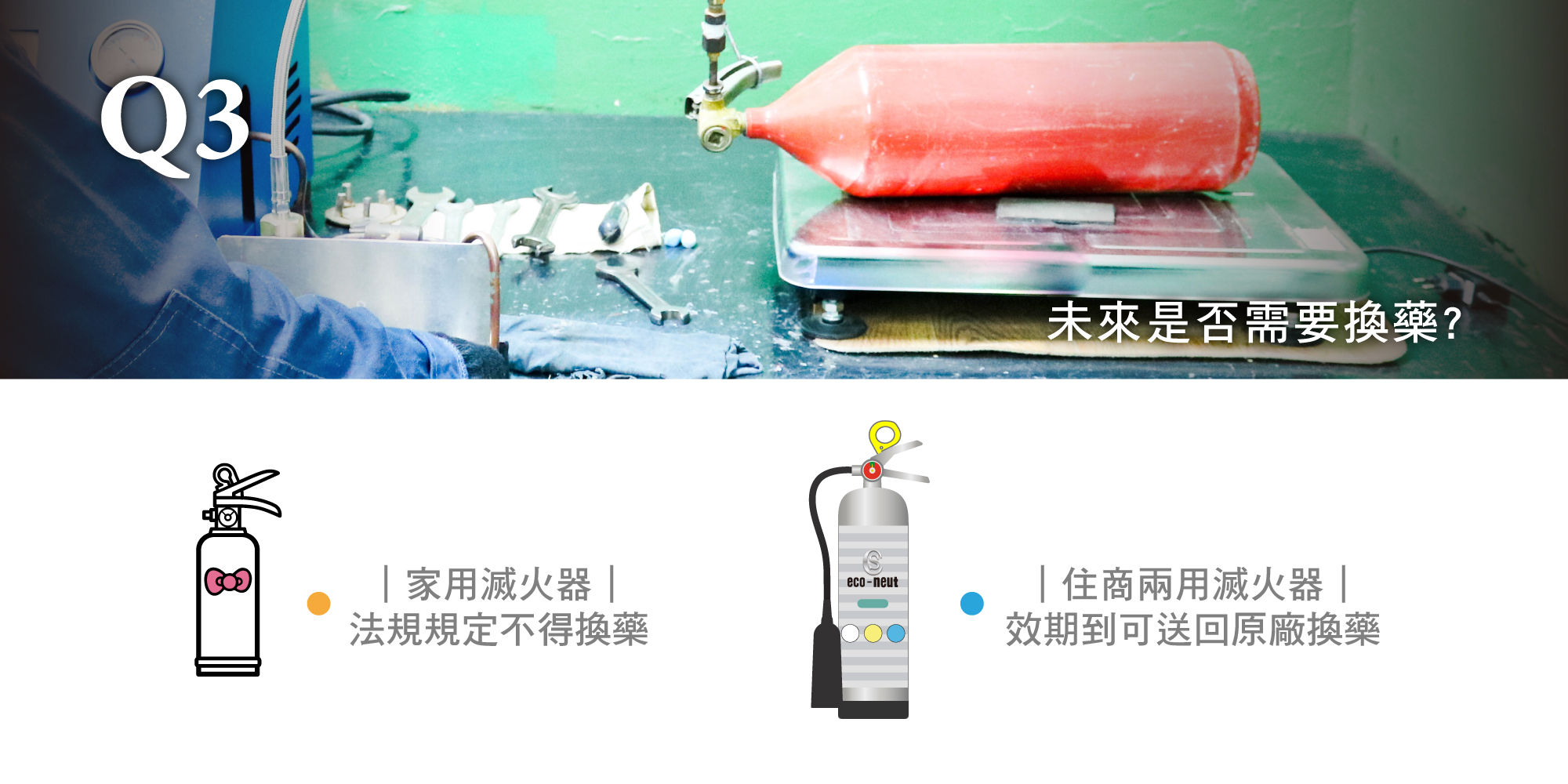A:住宅用滅火器依據消防法規規定,是不能再換充的;因強化液屬於不汙染環境的環保、潔淨藥劑,所以到期後,藥劑可以直接噴出和自來水一起排放到下水道,瓶身資源回收即可,是相當環保又方便的滅火器。