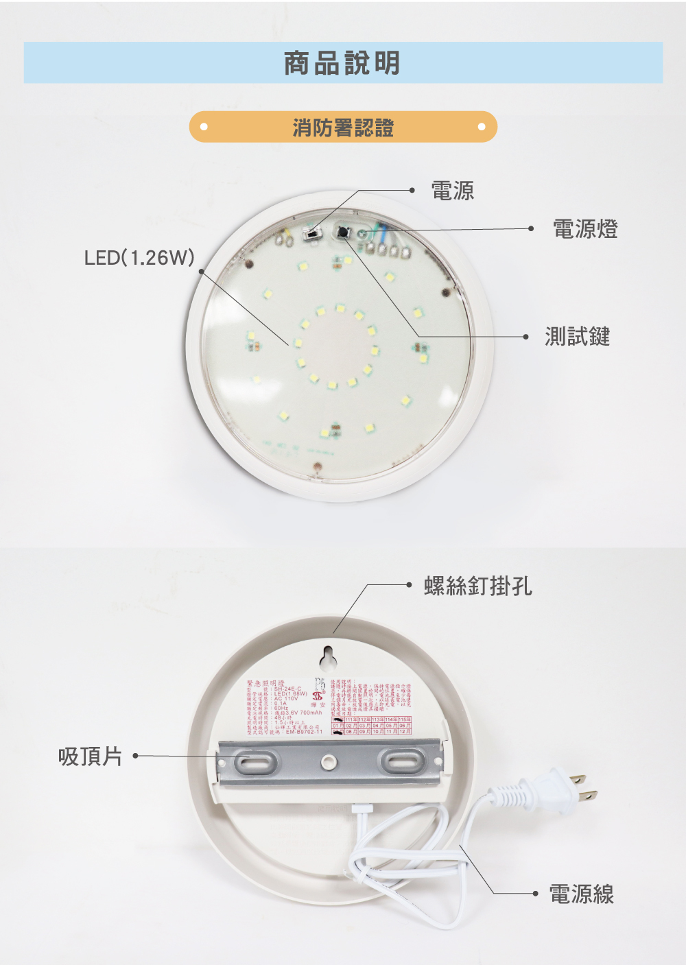 時尚圓形LED緊急照明燈-24顆(緊急照明90分,內建吸頂片)|正德防火